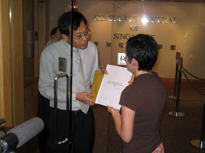 逾30名香港法轮功学员从中环遮打花园出发,游行到新加坡驻香港总领事馆。学员代表在领事馆门前宣读公开信,指自今年5月28日新加坡媒体公布了原中共610头目李岚清接受新加坡内阁资政李光耀邀请访新后,新加坡连续发生了一系列企图遣返法轮功学员,取缔法轮功讲真相活动的事件。