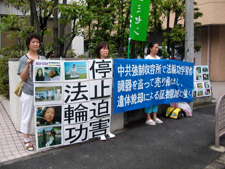 在领馆前,大法弟子们打出了写有“强烈抗议中共劳教所摘取法轮功学员人体器官、攫取暴利,将遗体焚烧以消灭罪证的暴行”内容的横幅,以及“停止迫害法轮功”的图片,活动从上午开始,一直持续到晚上。