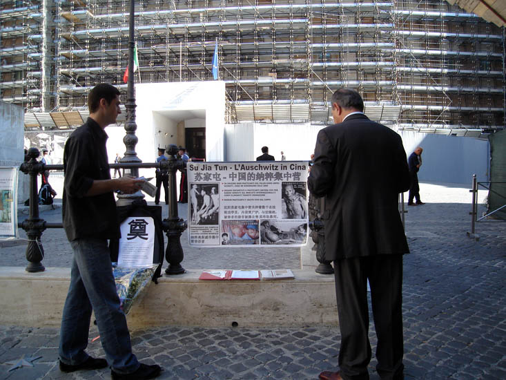 下午学员在中国驻意大利大使馆附近抗议长达7年的残酷迫害,悼念7年来被迫害致死的同修。在场值班的数名警察被庄严,肃穆的“奠”所震撼,每人又一字一字的从新读了一遍真相图片。