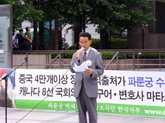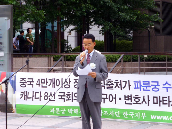 ![]() 韩国法轮功学员在首尔新加坡驻韩国大使馆,就新加坡政府指控新加坡当地法轮功学员“非法集会”一事进行抗议,韩国法轮功发言人吴世烈在集会中发言 |