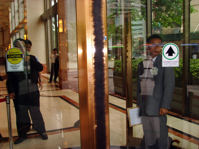 ![]() 韩国法轮功发言人吴世烈被“金融大厦”管理人员困在自动旋转门内 |