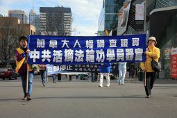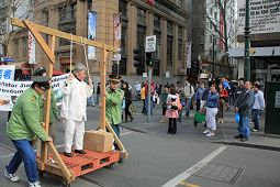 今年的反迫害游行队伍由4部份组成:大法简介、洪传世界,悼念被迫害致死的学员,酷刑展示以及揭露活摘器官罪行。一些学员一边面对面讲真相,一边发资料,游行队伍所经之处,人们纷纷接过真相资料仔细阅读,在看过、听过真相之后,表现出极大的震惊、同情和对中共暴行的唾弃。