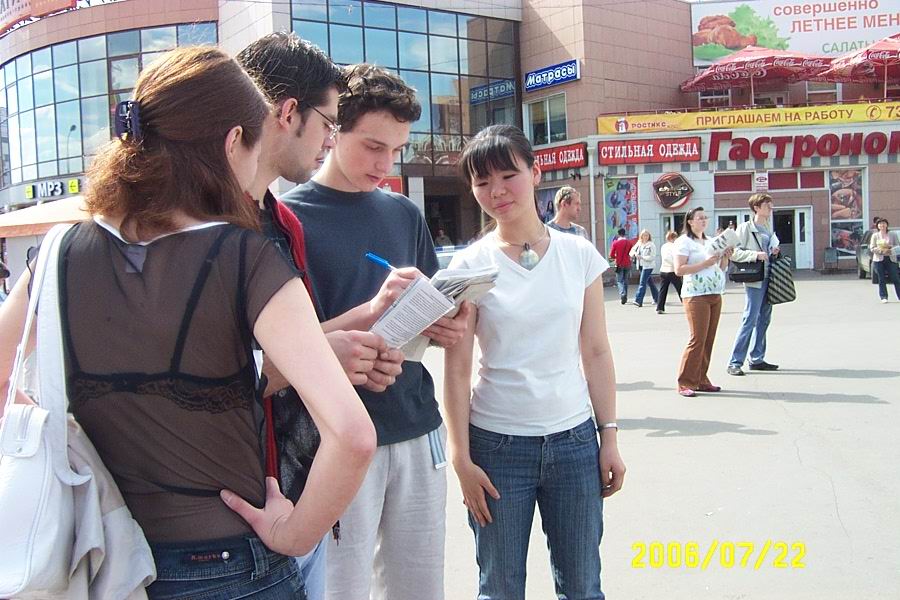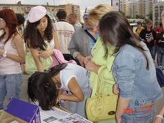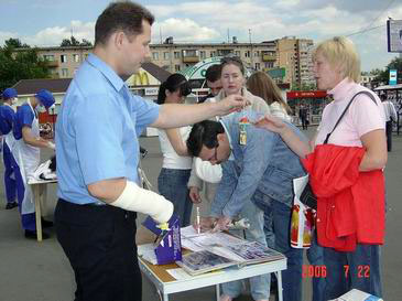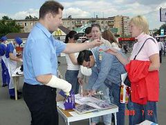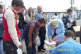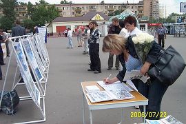 历时三小时的集会,学员用扩音器不断的向人们介绍什么是法轮大法及洪传世界近80个国家的盛况。向人们讲述中共七年来迫害法轮功的真相。过往的行人不断的涌到我们集会的现场,很多人仔细看展板,认真听学员讲真相,人们都不敢相信在当今世界上还存在着这么邪恶的迫害。很多人自动的拿起笔在呼吁彻查中共罪恶的信上签名,以表达对正义的支持和对行恶者的谴责。在真相面前,人的良知被唤醒,现场多次呈现排队签名的景象。