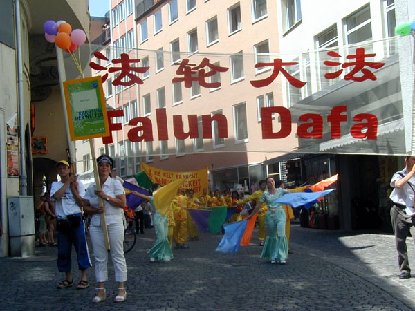 法轮功团体几年来都应邀参加了这项活动,举办单位称赞法轮功很平和。这次来自奥格斯堡周边及奥地利的法轮功学员参加了活动。中午1点,城市和平行动的游行拉开了序幕,多姿多彩的各种团体吸引了大量的观众,在行進过程中,观众给与热烈的掌声。游行队伍穿越奥格斯堡的主要步行街,整个全程大约進行了一小时。