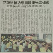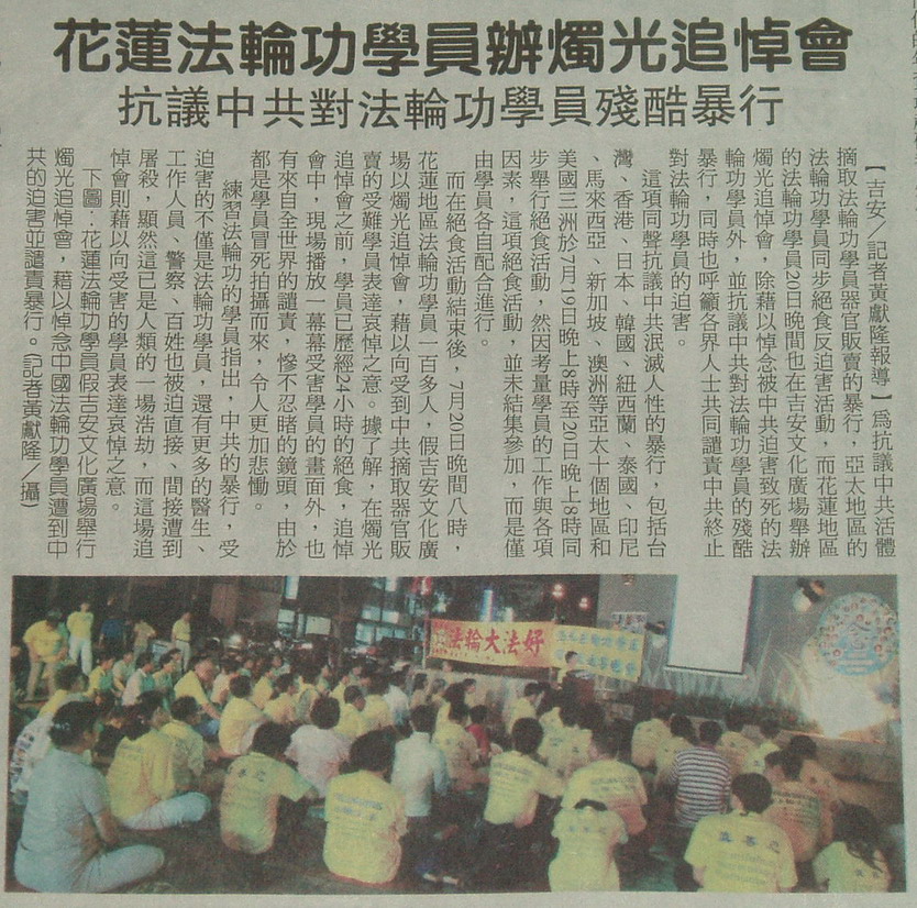 报道还指出:“在绝食活动结束后,7月20日晚间八时,花莲地区法轮功学员一百多人,假吉安文化广场以烛光追悼会,藉以向受到中共摘取器官贩卖的受难学员表达哀悼之意。据了解,在烛光追悼会之前,学员已历经24小时的绝食,追悼会中,现播放一幕幕受害学员的画面外,也有来自全世界的谴责,惨不忍睹的镜头,由于都是学员冒死拍摄而来,令人更加悲恸。”