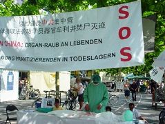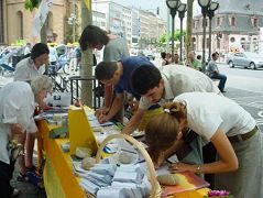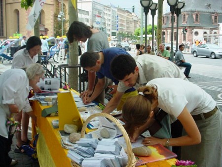 法轮功七年后的7月20日和7月22日(星期六),德国法兰克福(Frankfurt)法轮功学员在中领馆前和市中心购物街举行活动,和平抗议迫害,向中国人和德国民众揭露中共活体盗取中国法轮功学员器官等惨绝人寰的迫害事实。