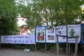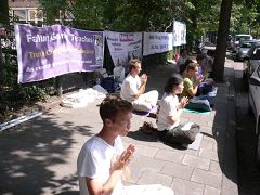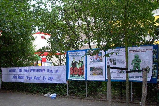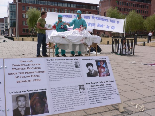 2006年7月20日清晨9点,荷兰法轮功学员聚集在中领馆门前,悬挂起“法轮大法好”的真相及曝光中共邪*党-对法轮功学员残酷迫害的横幅。尤其是揭露中共活体摘取器官的大型图片震惊了过往路人。