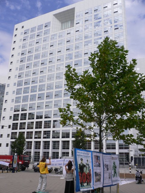 下午1点,荷兰法轮功学员再次集会在国际刑事法庭前的月亮广场。呼吁国际刑事法庭维护罗马宪章的神圣原则,伸张人间正义。