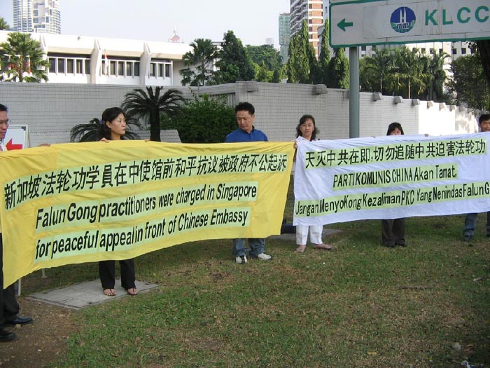十天后的7月20日,三位法轮功学员在中共驻新大使馆前绝食抗议中共迫害法轮功达七年之久。不久后,他们被警方逮捕并在当天以“带有共同意图的通过展示侮辱性文字進行骚扰(Harassment by displaying insulting writings – with common intention”起诉。事实上,他们只是以和平的方式在中使馆前抗议。