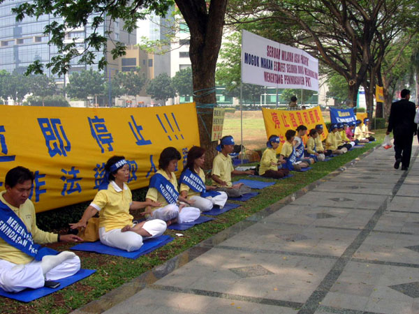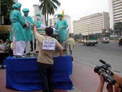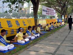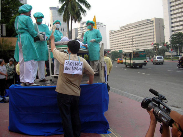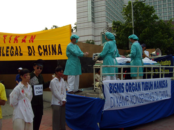 印尼法轮功学员自上午十一时至午后一时在中使馆前表达抗议,午后三时开始,在雅加达圆形喷水池对面的“印度尼西亚酒店”前举办真人模拟演示,揭露中共活摘法轮功学员器官,并点燃烛光悼念遭迫害致死的大陆同修。