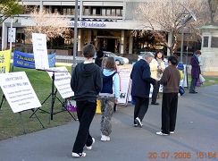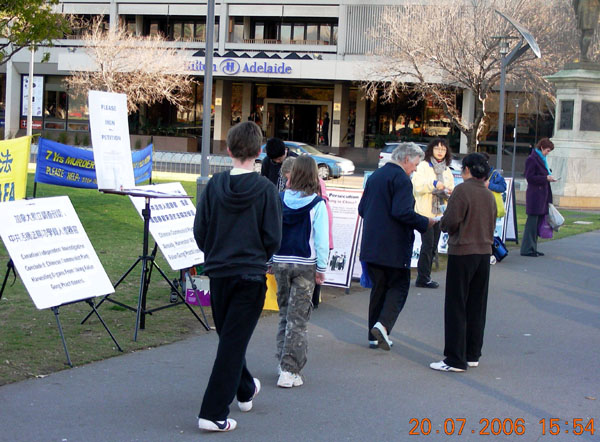 【明慧网2006年7月26日】2006年7月20日、22日,南澳法轮功学员在阿德雷德市中心维多利亚广场举行活动,向澳洲民众进一步揭露中共活体摘取法轮功学员器官的暴行,呼吁社会各界伸出援手,支持“国际联合调查团”进入中国大陆调查劳教所真相,彻底结束已持续七年之久的中共对法轮功学员的残酷。