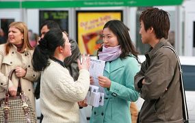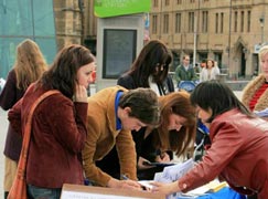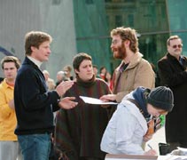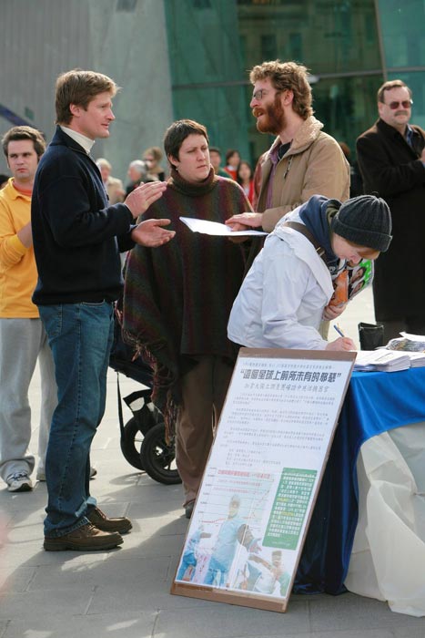 ![]() 《时代报》记者在集会现场拍摄活摘器官模拟演示 | ![]() 民众纷纷签名声援中国法轮功学员和拿取真相资料 |