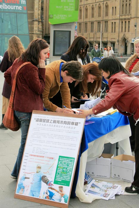 2006年7月23日,由澳大利亚维省墨尔本自由中国主办的“呼唤正义良知,聚焦最基本的人权”公众集会在市中心联邦广场举行。集会由自由中国主席迈克尔.安德森(Michael Andersen)主持,维省议员、地区市市长、民主人士、维省法轮大法学会及多个社团代表到场发言,谴责中共的反人类罪行。现场有图片展、模拟演示中共活摘器官实景,场面震撼。澳洲发行量最大的《时代报》及当地电视台進行了现场采访。