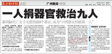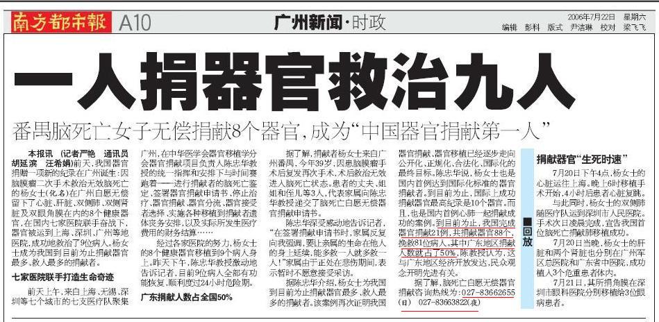 至今邪*党-不敢承认中国近几年来器官移植主要来源是把法轮功学员作为活体器官供体,但是《南方都市报》2006年7月22日报纸却把这个“狐狸尾巴”露出来了。既然说,“到目前为止,我国完成器官捐赠21例,共捐献器官88个”,那么近年来疯狂增长的器官移植来源是什么呢?