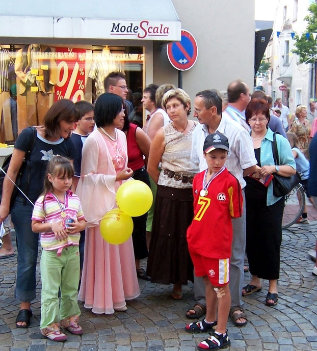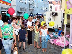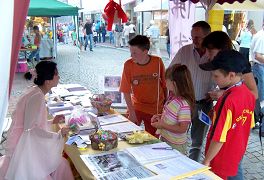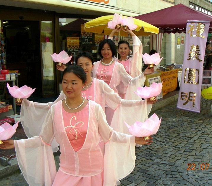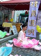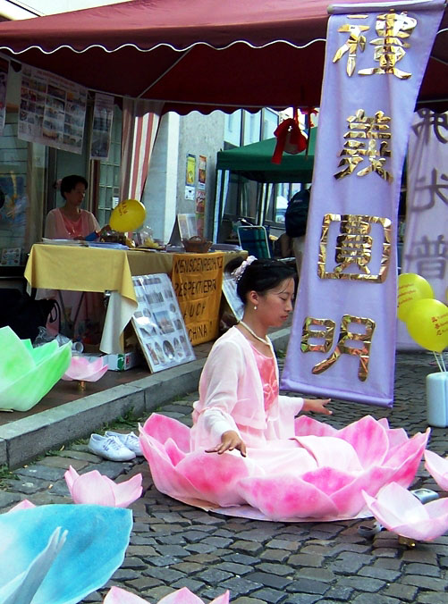 在积极讲迫害真相的同时,法轮功学员们考虑到千年庆典的节日气氛,精心准备了中国传统舞蹈的表演和功法演示,让参观者赏心悦目。尤其是第五套功法表演,让许多调皮的孩子们安静起来,久久停留、观看。一位爸爸说,真奇怪,孩子现在这么静,看来我们家也得买点打坐的音乐给孩子听听。不少孩子和大人都问,他们是真的吗?意思说,打坐的学员静的好象一尊雕像。一个孩子还用手碰碰打坐的学员,学员睁开了眼。孩子笑了,说:呀,是真的,接着又说:真美啊。