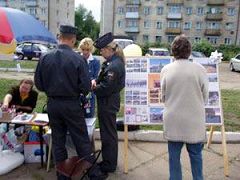 【明慧网2006年7月28日】2006年7月23日,俄罗斯雷宾斯克市法轮功学员在市区巴列特广场举行活动,向人们介绍法轮大法的美好和中共七年来残酷法轮功的真相。广场上摆放着各种真相展板;部份学员向人们演示五套功法;还有一张小桌子放着各种做纸莲花的材料,学员一边教人叠莲花一边讲真相。莲花代表着修炼者圣洁和美好的品质,出淤泥而不染。小小纸莲花人见人爱,一个孩子双手捧着莲花高兴的说他闻见了香味,不仅是孩子,连执勤的警察都陆续地来听真相,把纸莲花挂在警车上。