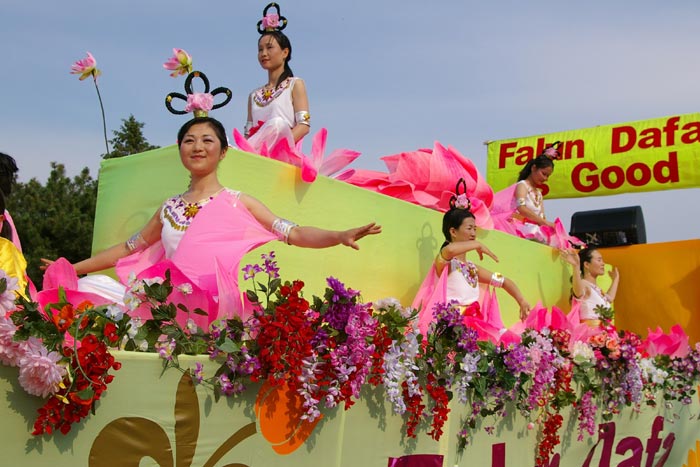 花车上美丽的“仙女们”演示着祥和的法轮功功法