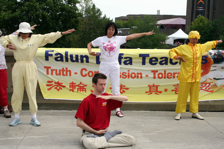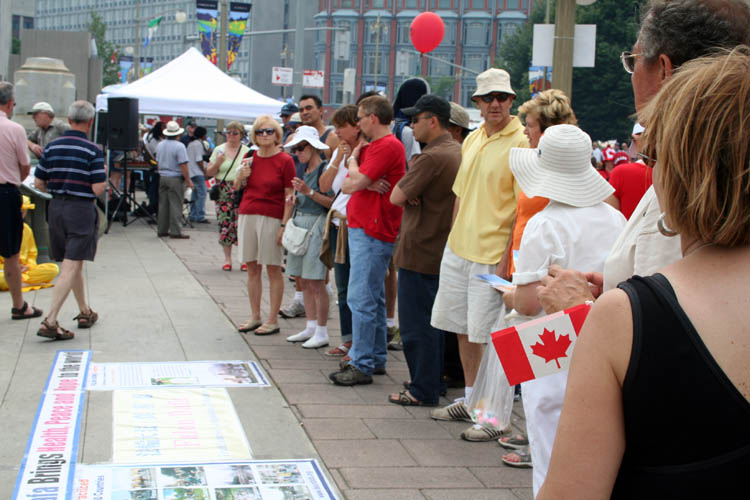 。法轮功学员展示给加拿大人民的信息是“法轮大法带给世界健康、和平和希望”。十余名游客主动表示要现场学功。学员们宁静的功法演示和欢快的腰鼓表演吸引了成千上万的游客驻足观赏。一直到晚九点,还不断有游客经过,听真相,接资料。