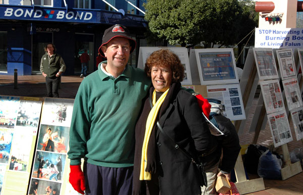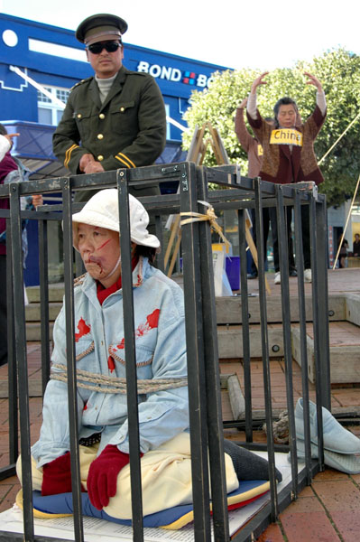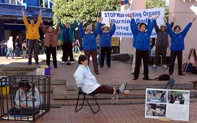 【明慧网2006年7月30日】2006年7月29日,新西兰法轮功学员于罗陀如阿市(Rotorua)中心的City Focus广场举行集会,揭露中共对法轮功学员七年的残酷,特别是近几个月来被曝光的中共在监狱、劳教所等地活体摘取法轮功学员器官牟利并毁尸灭迹的反人类罪行。新西兰法轮功学员们以真人模拟器官摘取、模拟被关进小笼子受折磨以及大量的图片向路人揭露中共对法轮功学员的迫害,并广泛征集签名,呼吁制止中共暴行。