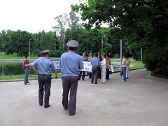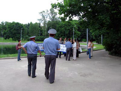 莫斯科法轮大法佛学会负责人依万•石卡丘克(Ivan Shikaqiuk)现场发表声明说:“安全部门的代表不让我们举行计划中的集会,据他们讲是地区政府的领导不同意举行这样的集会。我们的做法是完全合法的,正义的。因为按照俄罗斯法律,举行任何集会只需申报,不需要有关部门批准。但是地方政府无视这些法律,并警告说如果我们举行集会,将被拘留。不管他们怎么做,我们是履行自己一个公民的权利。我们今天举行活动的目的是对在中国发生的群体灭绝罪行进行抗议,这是每一个有良知的人所必须和应该做的。俄罗斯公民应该对(中共)非法虐杀无辜善良人的行为表明自己的态度,这不只是为别人,也是为俄罗斯自己,如果人人都有这样的良知善念,那这样的罪恶就不会在俄罗斯重演。我们相信人民会理解和支持我们的。今天发生的这一切,我们将诉诸法律,以求还人权公正于民。”