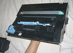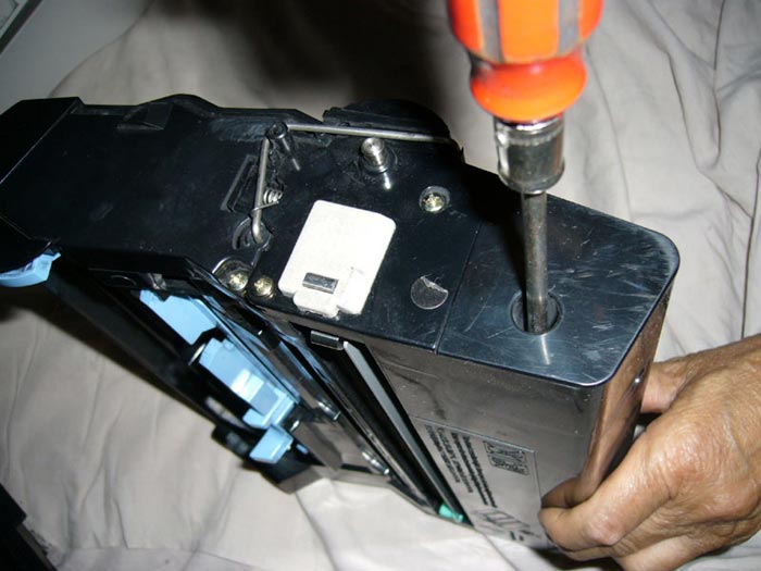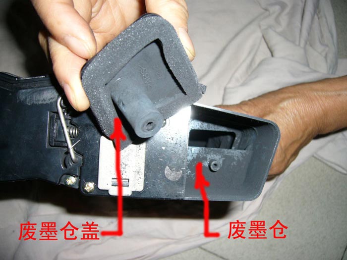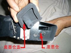 图解1 清废粉:从机器中取出硒鼓,取下墨粉盒,将废粉仓两侧螺丝卸掉,打开两侧废粉仓盖,轻轻倒尽废粉,可以看到废粉仓是通透的。
