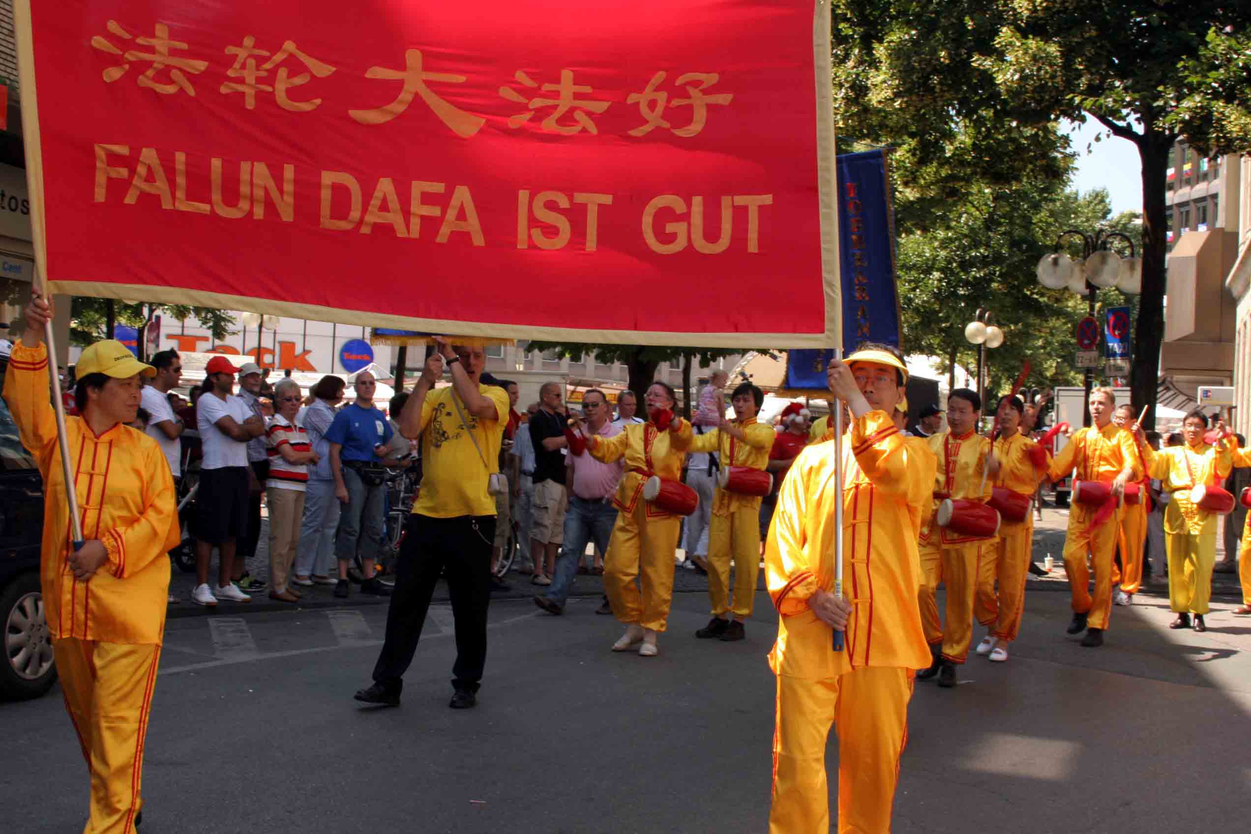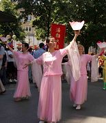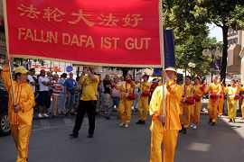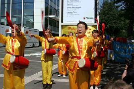 ![]() 法轮功学员的游行队伍第一次出现在盖尔森基辛市 | ![]() 精神抖擞的腰鼓队 |