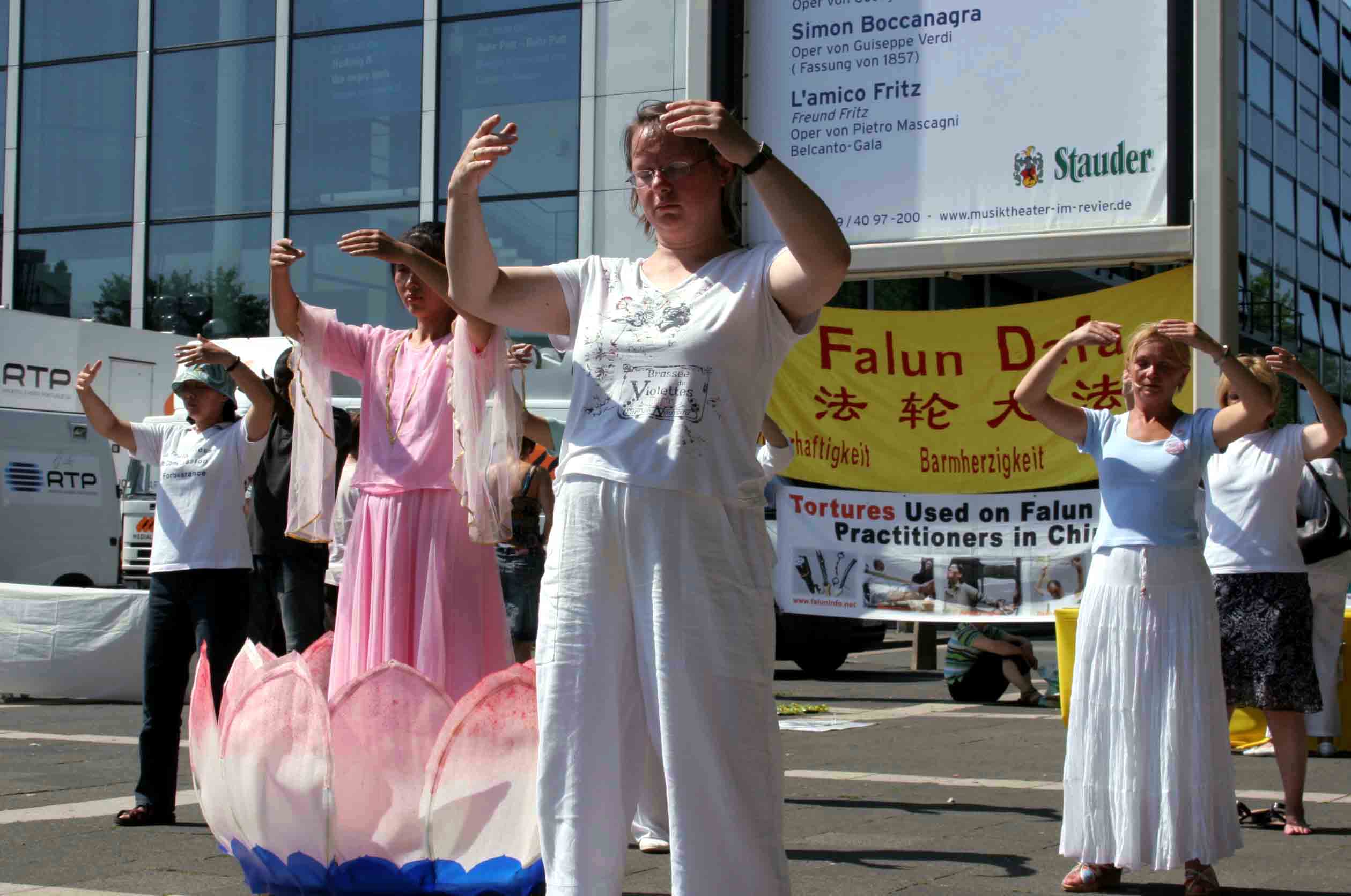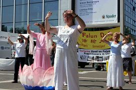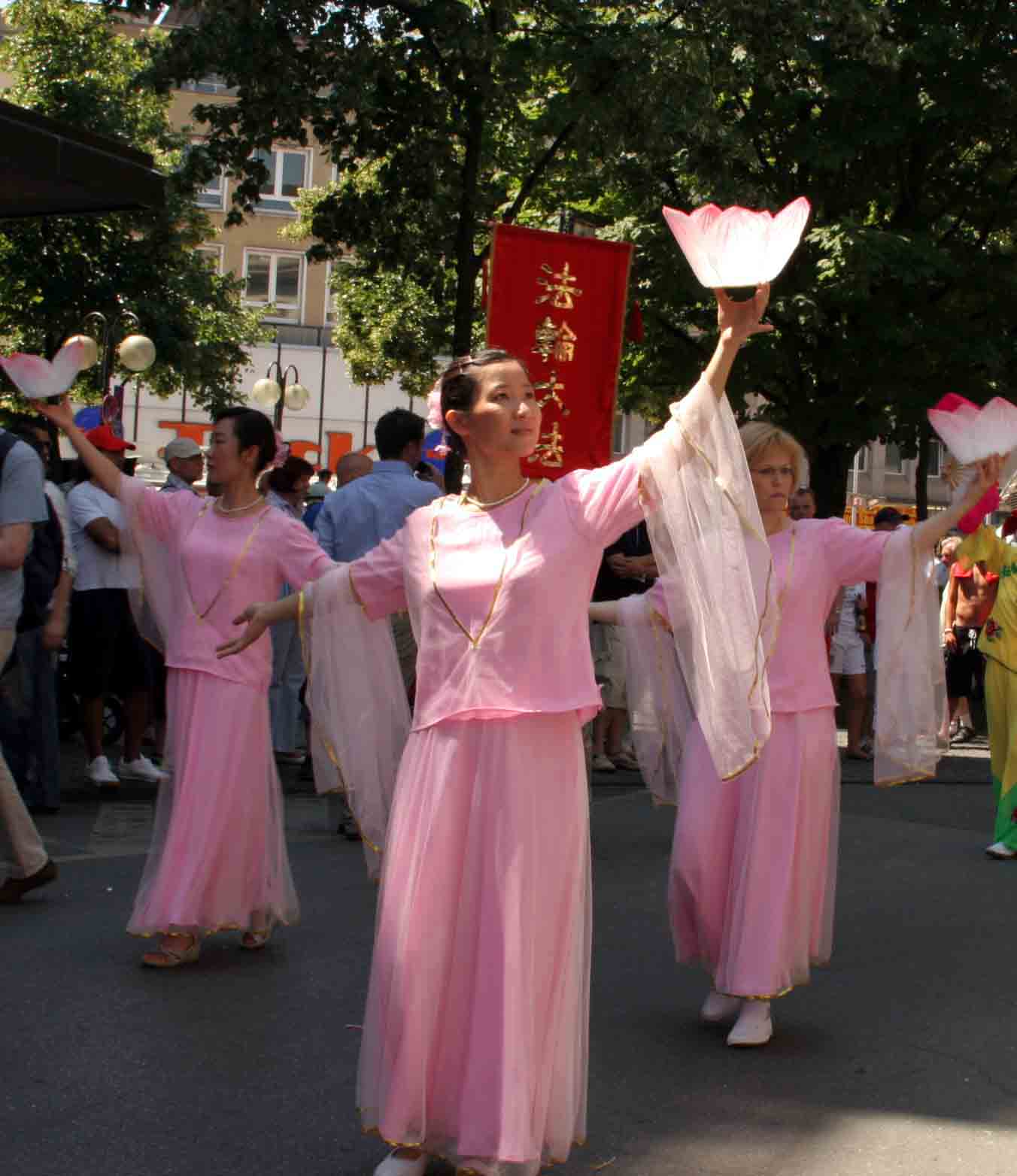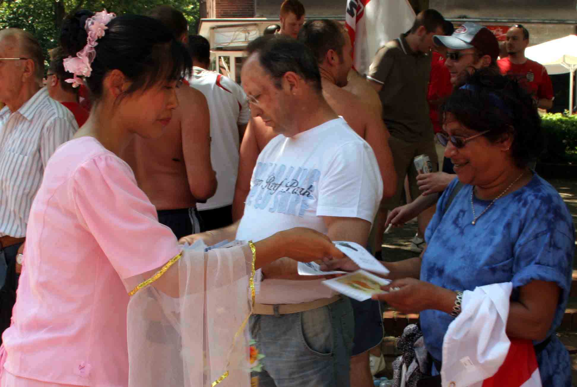 在这个好似属于足球迷的日子里,法轮功游行突然出现在这个城市的大街小巷,吸引了世人的眼光,从住宅窗户里,从咖啡屋和餐馆里,及摇下的汽车窗里,也都纷纷传出惊叹声和喝彩声,鼓掌叫好和伸手索要传单的,一路不断,使几名沿途发传单的学员应接不暇。两名跳舞的女学员不得不随机应变,也转而沿途发传单。