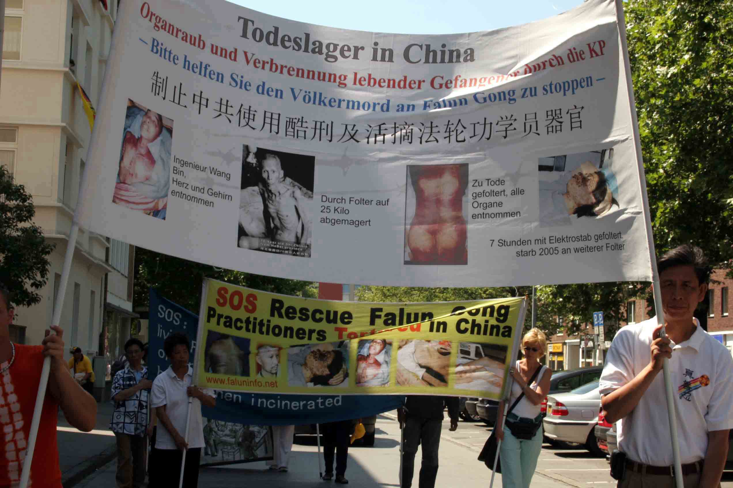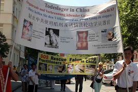 游行队伍由腰鼓队领先,学员们“法轮大法好”的响亮呼声在阵阵鼓点的烘托下传出很远;身着鲜艳舞装的十多名女学员,在“法轮大法好”歌曲的伴奏下翩翩起舞。由图文组成的几幅大型真相横幅后面,是身着白衣的法轮功学员举着部份被迫害致死的大陆同修遗像的队伍。与游行队伍并行缓缓开动着反酷刑展拖车,数名学员在模拟演示迫害酷刑和中共活体摘取法轮功学员器官,拖车的周边挂着揭露迫害真相的条幅,有“制止中共使用酷刑及活摘法轮功学员器官!” “中共,停止迫害法轮功!”等反迫害标语。