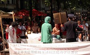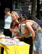设在音乐大剧院宽阔广场上的真相信息台吸引了许多游人和球迷,不少人在了解真相后主动要签名,表达反对中共迫害法轮功的意愿。有一对善良的德国男女青年,在了解到真相后就决定要参加活动,或游行举横幅,或发传单,什么都行,总之就是要帮法轮功学员做一些事。从游行队伍出发到返回的三个多小时里,他们就一直和几个学员留在信息台前发传单。