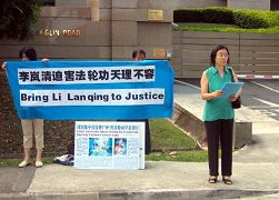 法轮功学员同时也告诫新加坡政府:全世界都已了解了中共迫害法轮功的真相,都在摒弃严重践踏人权的中共,共同呼吁制止迫害;李岚清在全世界多个国家已被起诉,包括美国、法国、比利时、台湾、德国、加拿大、新西兰、智利、荷兰、日本以及瑞典等。请记得善恶有报是天理,切勿与狼共舞!