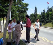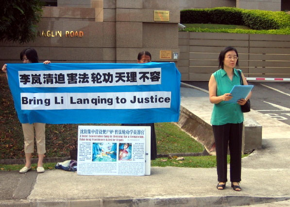 此外,法轮功学员一早也到中共驻新加坡大使馆前发正念,抗议中共迫害法轮功。有位报馆的记者还主动到现场采访抗议的目地。同时学员还在中使馆前宣读了“法轮大法学会公告”和“新加坡法轮功学员公开告诫李光耀”的公开信,严正抗议李岚清迫害法轮功。