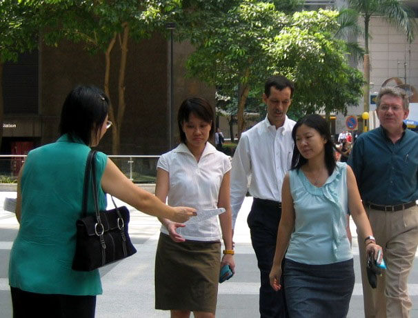法轮功学员一早就在莱佛士金融中心派发“新加坡法轮功学员公开告诫李光耀”传单,郑重提醒新加坡政府,李岚清是中共迫害法轮功的元凶,在世界上多个国家以酷刑罪、反人类罪和群体灭绝罪被起诉,甚至被加拿大皇家骑警列入监视名单,一旦進入加国国土,皇家骑警将对指控進行调查。