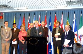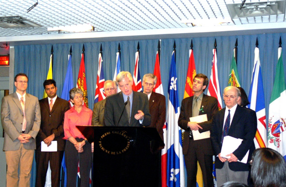 ![]() 麦塔斯(右一)和乔高(讲话者)在5月8日的新闻发布会上,执政党联席会议主席雷翰•杰佛(左二)代表加拿大政府到场支援 |