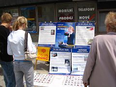 学员们在街上分送真相简介,摆设横幅和展板,让路人明白法轮大法的真善忍法理,以及在中国的法轮功学员被中共非法关押在秘密集中营、劳教所,甚至被活摘器官致死的真相。许多行人停下脚步,读着真相信息材料、取走简介,并在反对中共劳教所、秘密集中营活摘器官的请愿文件上签名。他们之中有许多人因以前与法轮功学员的接触,早已了解法轮功,明白了中共迫害的真相。