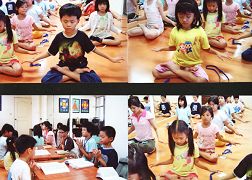 到了第三天,大伙儿渐渐熟悉,有时读法时会有交头接耳心定不下来的情况,通常这时候采取盘腿静坐3-5分钟。大人能语气缓和的、慢慢的提醒他们把心静下来,自己也以身作则,效果很好。也告诉他们,师父在“济南讲法”中提到“越扇越热”的道理,所以上午即使没开冷气,他们也不觉的热。