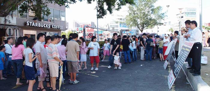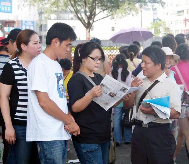 假日的淡水小镇,人潮络绎不绝。在人来人往的淡水老街入口处,学员们放置了揭露活摘器官的真相展板、征签布条,另用广播的方式呼唤人们的正义良知,得到很大的回响。很多人认真的看着展板的内容,也有很多人主动询问真相。