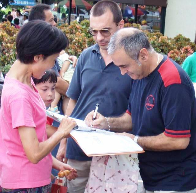 有位太太述说她认识一位台商去大陆换肝,回来一年后去世。她对中共的所做所为很愤怒。一位年轻的男士和学生,当了解了中共活摘法轮功学员的器官去牟取暴利时,同声谴责这样的暴行。除了签名之外,他们还表示希望加入义工的行列,共同呼吁制止中共暴行,最后他们留下了联络电话和地址。