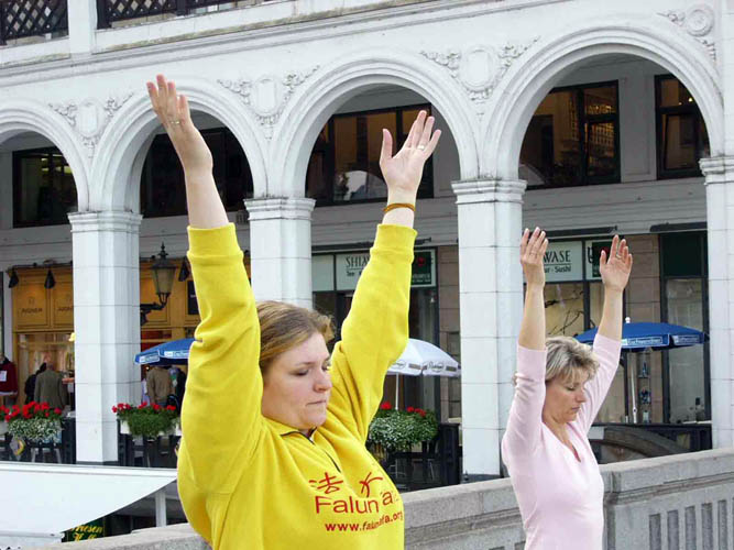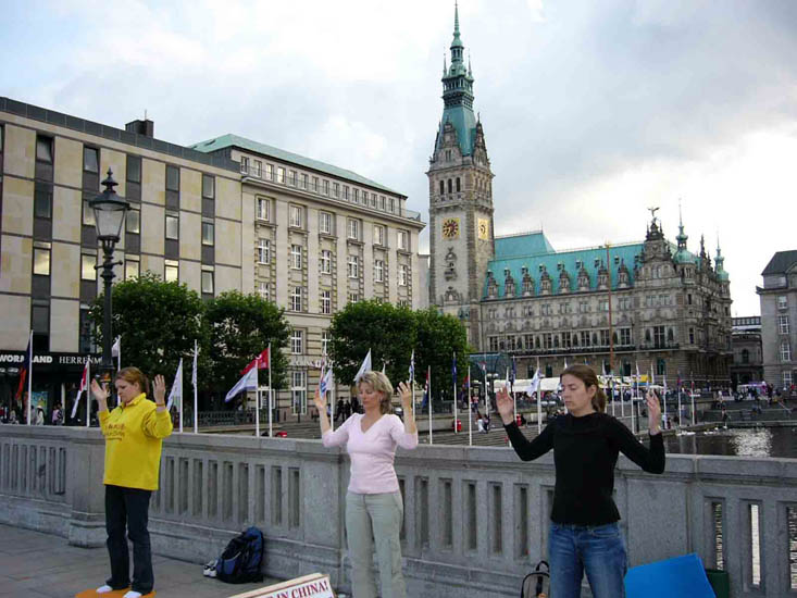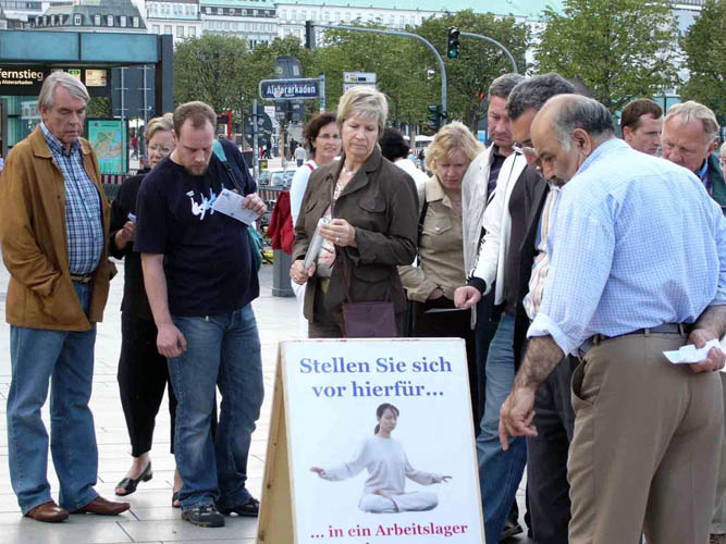 2006年8月11日下午,处子堤(Jungfernstieg)上响起了法轮大法的炼功音乐。络绎不绝的行人纷纷在揭露中共活体摘取法轮功学员器官罪行的展板前停住脚步,悲伤,愤怒,震惊写在他们脸上。一群一群的人围在法轮功学员身边全神贯注的听着他们的讲述。许多人接受了真相资料,不少人主动向学员了解更多详情。
