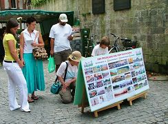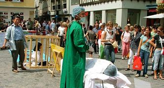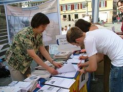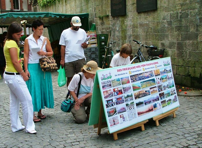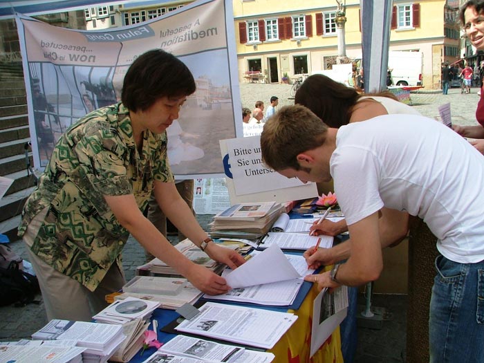 展位设在蒂宾根最大的教堂Stiftskirche前,那儿也是最热闹的步行街。绝大多数的行人都非常愿意了解真相。许多路人看了展板和酷刑演示之后主动过来签名表示支持法轮功。
