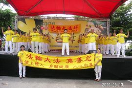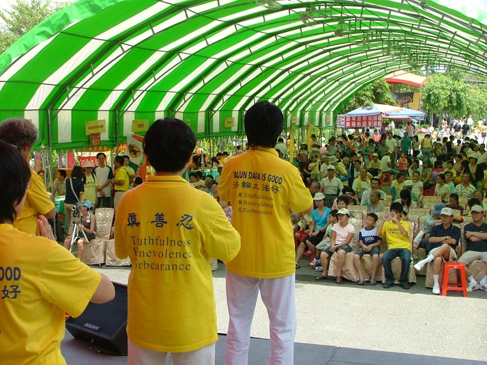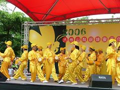 神威腰鼓队由身着金黄炼功服的法轮功学员组成,他们神采奕奕,威武的打腰鼓以及缓慢圆柔和的五套功法表演,在这摊贩的喧闹声中,呈现一片祥和,为今年文化节带来最不同的演出,吸引了许多游客的目光。现场节目主持人很感兴趣的在台下学炼着台上表演的法轮功功法动作,更有民众当下询问学员何处可以炼功。