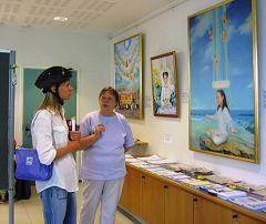 法轮功学员向图书馆工作人员讲述了法轮功在世界上80多个国家洪传,得到上千项褒奖的盛况,而在中国大陆自1999年7月20日,中共开始采取灭绝人性的手段迫害法轮功修炼者。参展作品的作者有的本人就曾在中国大陆遭关押迫害。