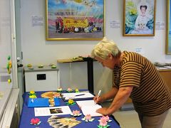 学员在展台上摆放了多语种的法轮功真相资料、留言簿及反对中共迫害法轮功的征签表,同时摆放了学员折叠的纸莲花。