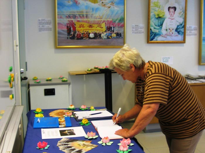 一位女士听后不解的问:在中国为什么要迫害法轮功?学员拿起展台上的《·九·评*共产党》告诉她,这篇文章里揭露了中共的邪恶本质,由于它实行“假、恶、斗”而不能容忍修炼“真、善、忍”的法轮功。那位女士说:我能帮你们做点什么?学员请她更多的了解法轮功被迫害的真相和中共的邪恶本质,然后帮助把这些告诉芬兰政府和媒体及她周围的人。