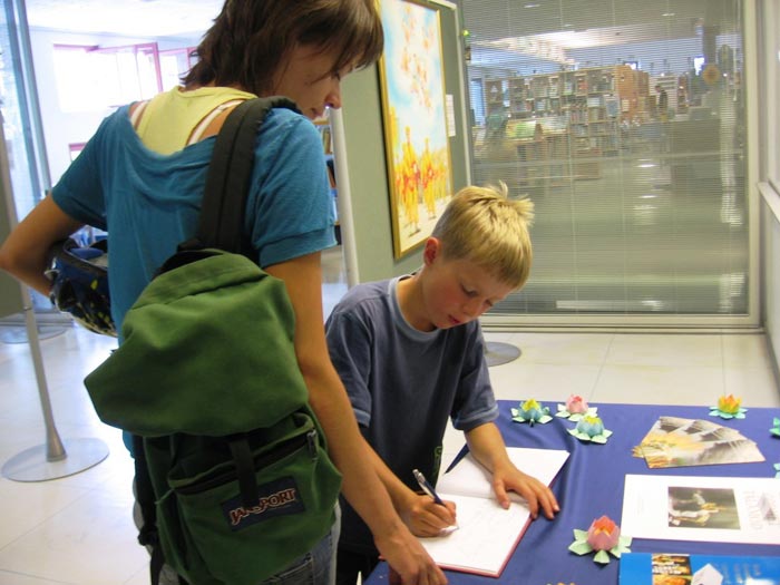 很多家长带着孩子一起来看画展,只见家长耐心的给孩子们读着解说词,并不时的回答着孩子们的提问。最后又带孩子一起去签名声援法轮功。
