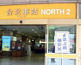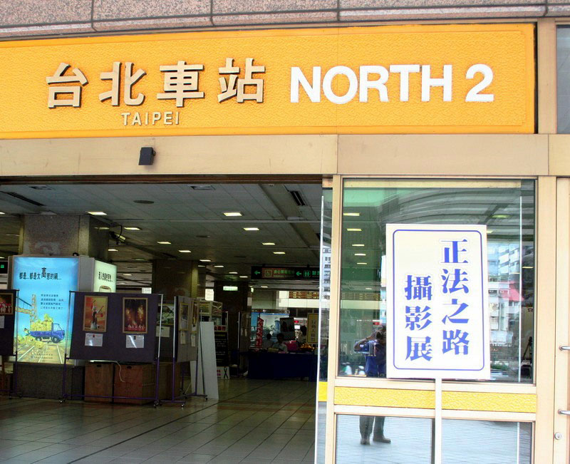 2006年8月5日星期六这一天,台铁台北车站大厅内气氛大不同,除了父亲节庆祝活动外,还有法轮大法正法之路摄影展第二次在此展出。去年此时适逢台风过境,此处连续二天三夜在车站大厅内播放《·九·评*共产党》影片,一批批因风雨暂时停留车站大厅内的旅客看到“·九·评*”,认清了共产党的“假、恶、斗”的邪恶本质──原来只是个靠谎言起家的西来幽灵。
