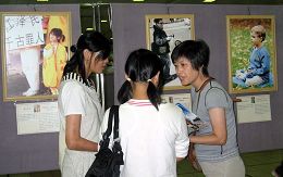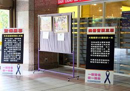 ![]() 台北车站“正法之路”摄影展 | ![]() 民众仔细听学员说明真相 |