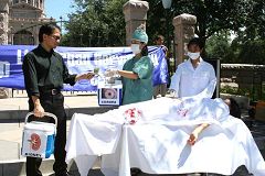 街上过往的行人有的了解了真相;有的签名表示支持营救学员的亲人;有的人看到学员在这里模拟演示中共活摘器官的情景,知道这正在中国发生着,觉的太可怕了,太残忍无人性了,非常气愤;有人还把这场景拍下来,表示会让更多的人知道。