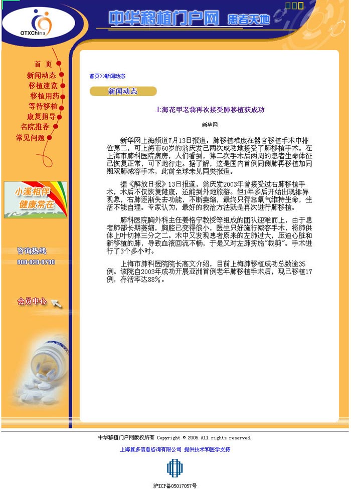 在中华移植门户网的一篇题为《上海花甲老翁再次接受肺移植获成功》(www.otxchina.com/s/News.asp)的文章报道: