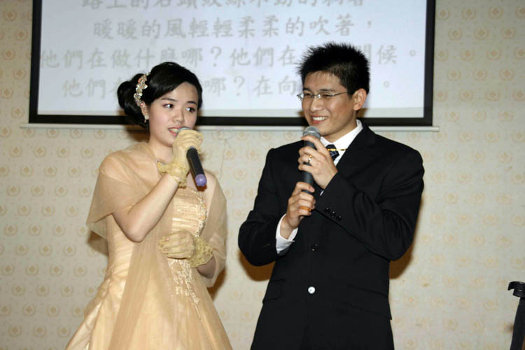 有共同的沟通语言及相处的方式下,获得双方父母的祝福,二人决定共结连理,选定2006年3月18日举行文订,同年6月25日举办婚礼。在准备订结婚的过程中,我们彼此有默契的想以表演的方式将大法的美好带给身边的亲朋好友,也让来参与的朋友们知道,人与人相处要“真诚”、“善良”与“容忍”才能和谐快乐。根据这想法拟定了婚礼的表演节目,与父母讨论、取舍后,我们准备了下面的几个节目: