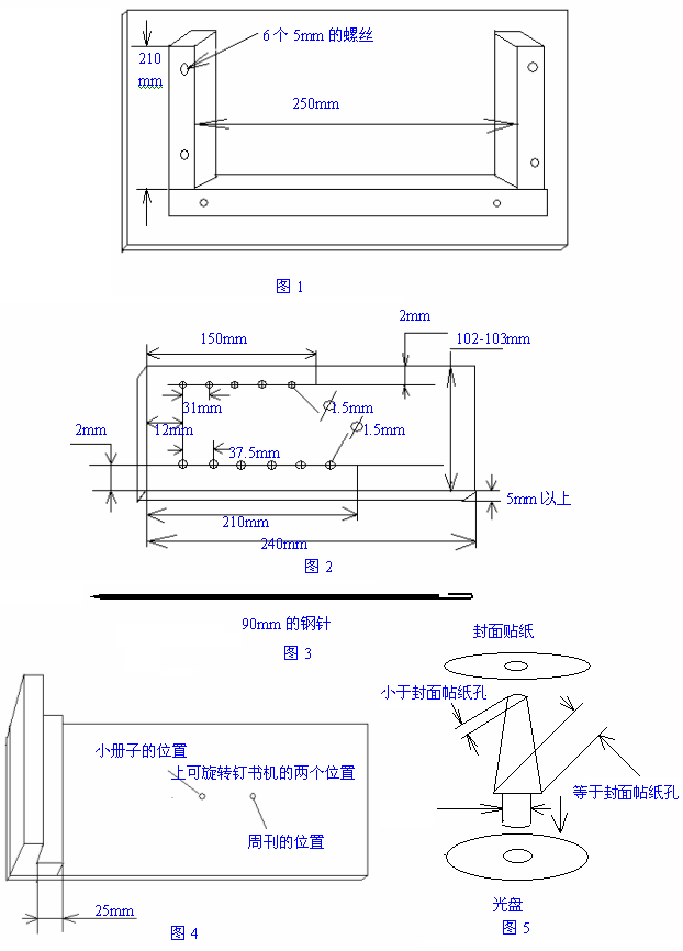 1, 如图1,用30mm的四方木条做成图1的模板,要求是必须成90度和平整,大号书或小号书切完后放在模板上,就可以保证有两个方向面是平整与书成90度,在要钻孔的位置上划一条线,然后盖上图2钢板(注:钢板上的小孔一定要保证是垂直钻出来的,钢板(最好是不锈钢,这样才可以保证干净,一般钢板要上油七。)厚度最好是5mm以上,这样才能保证书钻出来的孔也比较垂直,钻完孔后把书用纸板或木板夹住树起来放在图1模板的一侧,用四方长木条顶紧(这样保证在用钢针拉线时书不会拉变形),用钢针拉完线后立刻把另两个不平整的方向面切平整、上白乳胶水贴上封面书皮。